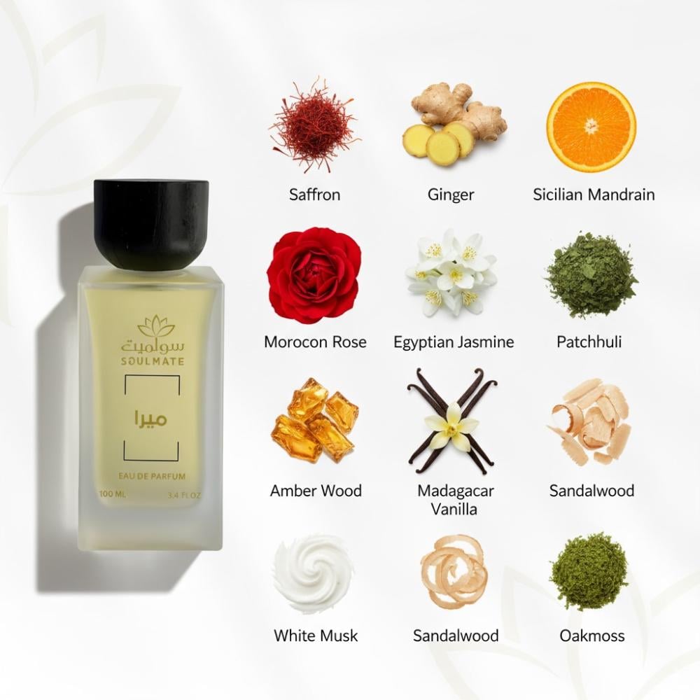 - عطر نسائي ميرا مزيج فاخر من الزعفران والورد والياسمين المصري.
